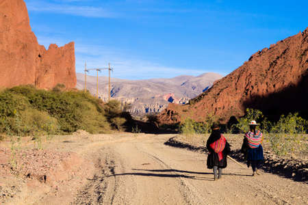 Bolivian people walking along dirt road,Bolivia. Bolivian landscape