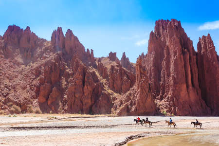 Horse riders crossing river from Duende canyon,Bolivia.outdoor activity.Bolivian nature
