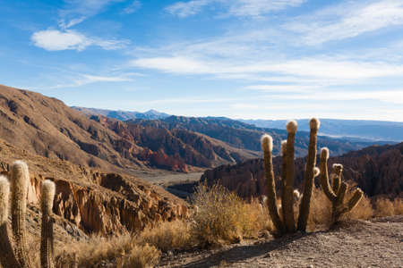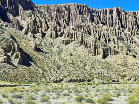 Eroded mountains overgrown with huge cacti in the Jujuy region on a sunny day, Argentina.
