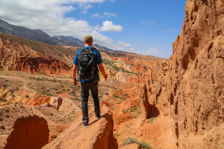 Issyk-Kul, Kyrgyzstan: Hiker on the red sandstone rock formations Seven bulls and Broken heart, Jeti Oguz canyon in Kyrgyzstan, Issyk-Kul region, Central Asia