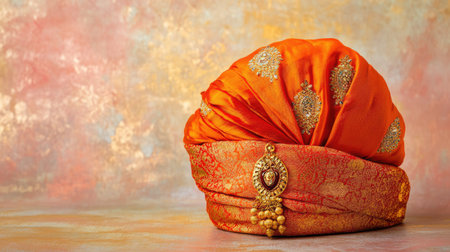 A stunning orange traditional turban adorned with intricate gold details. Perfect for showcasing cultural heritage and festive attire in photography.