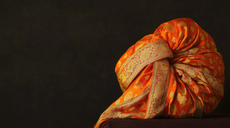 This image showcases a vibrant orange silk turban with intricate patterns, elegantly draped against a dark background, symbolizing cultural heritage and style.