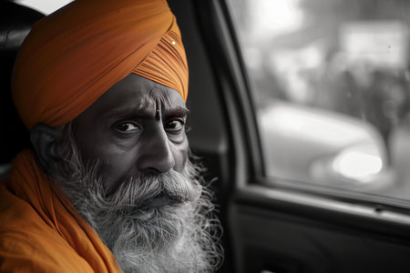 Reliable Sikh adult taxi driver. Transport taxi male portrait in turban. Generate AI