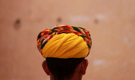 Traditional Rajasthani turban image with printed cotton bandhej focused