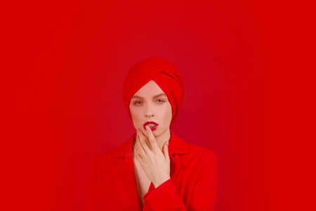 pretty woman multicolored turban decoration red lips attractive look red background