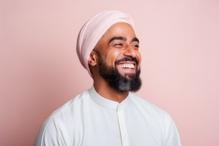 Portrait of a happy arabic man with beard and turban against pink background