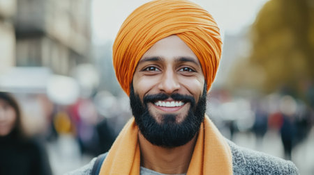 Young handsome sikh guy in traditional head wrap turban looking at the camera and smiles, close-up portrait of serene happy Indian male student, entrepreneur standing outdoor