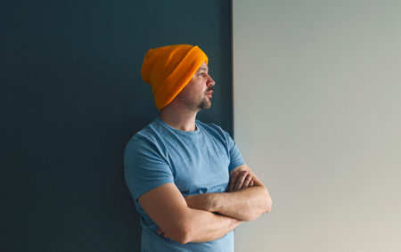 Young man in a blue T-shirt and a yellow hat stands with his arms crossed against a gray-blue wall. A thoughtful man looks out the window in a house or apartment. Copy space.
