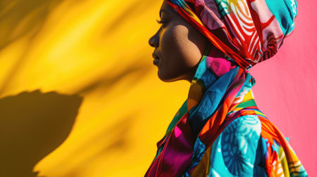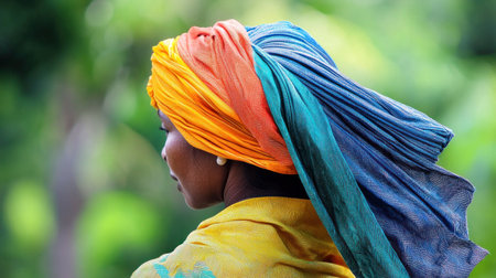 Profile of a woman wearing a vibrant turban headscarf