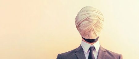 A businessman in a suit stands with a bandaged head creating a striking image of surrealism and abstraction in a minimalist background.