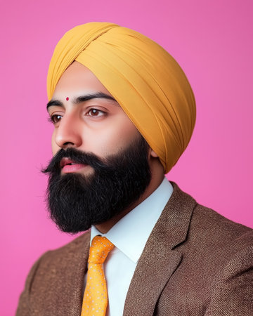 Portrait of Indian man in yellow turban and suit over pink background. Generative AI