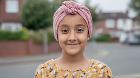 A young girl wearing a pink headscarf and a floral dress poses joyfully outdoors on a suburban street, capturing the essence of innocence and happiness.