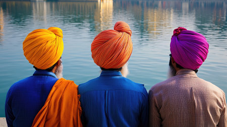 Sikh Men in Turbans at Golden Temple: Sikh men in vibrant turbans standing by the serene waters of the Golden Temple in Amritsar, reflecting spiritual devotion.