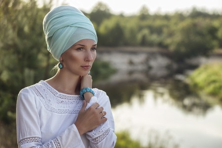 Young girl model, near the river, wildlife. In an interesting headdress.