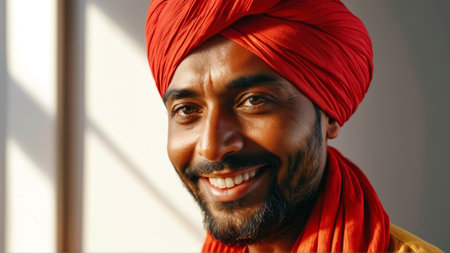 Confident man in red turban smiling in warm sunlight.