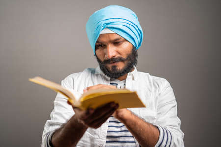 young sikh man reading holy religious Scripture for praying god on grey background - concept of spiritual belifes, worship and traditional culture.