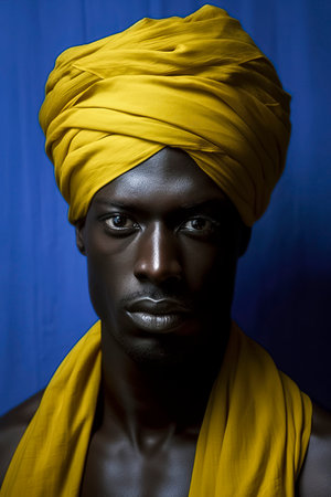 Elegance in Yellow: A Handsome Young African Man Adorns a Turban and Scarf, Set Against Blue Serenity