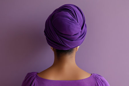 Cancer survivor with purple headdress seen from behind, symbolizing strength, healing, and awareness for World Cancer Day.