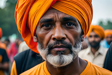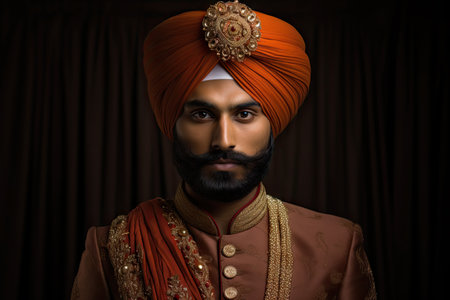 Indian man wearing an orange traditional turban and elegant patterned clothing