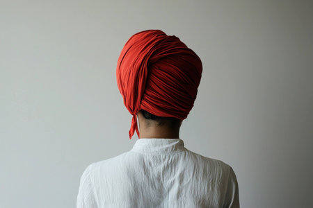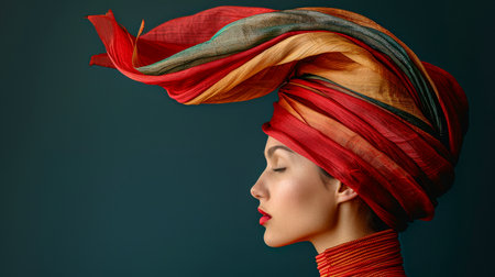 Woman with red turban looking away, minimalist backdrop highlighting her traditional attire and hairstyle. Elegance and cultural expression concept.