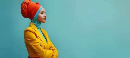 Woman in yellow jacket and turban with crossed arms