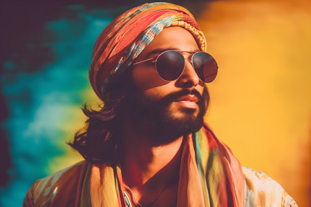 Handsome bearded Indian man wearing turban and sunglasses over colorful background.