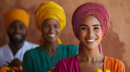 A joyful group of three individuals in vibrant traditional attire, smiling warmly against a textured background, holding colorful fruits. The atmosphere is one of happiness and cultural pride.