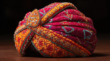 This stunning traditional Indian turban showcases vibrant colors and intricate embroidery, making it an ideal choice for cultural celebrations and fashion showcases.