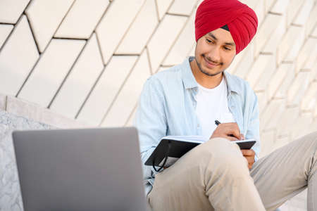 Modern Indian man in turban working with laptop outdoors. Hindu male in smart casual shirt watching webinar and writing down, taking notes with a pen, planning schedule