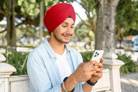 Happy and smiling indian guy in casual shirt and red national turban using smartphone outdoors, texting, chatting online, web surfing, using new mobile app in rested atmosphere