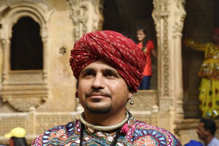JAISALMER, RAJASTHAN, INDIA November 2018, Tourist in traditional Rajasthani turban and costume near Kothari's Patwon ki Haveli