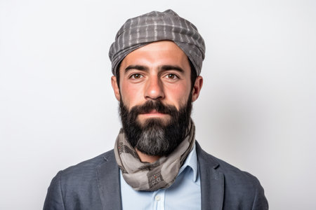 Handsome bearded man wearing a hat and scarf on white background