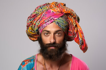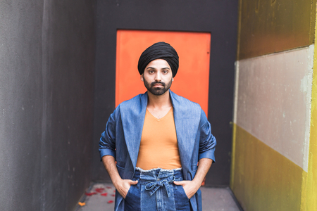 Young indian man wearing turban and colorful t-shirt.