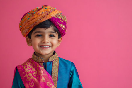 Portrait of a cheerful young Indian boy wearing traditional attire and a colorful turban, smiling against a vibrant pink backdrop