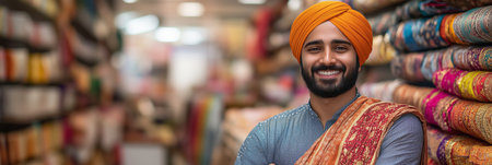Sikh man looking at camera with confidence in a fabric shop.