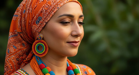 Portrait of a beautiful young woman wearing a colorful headscarf