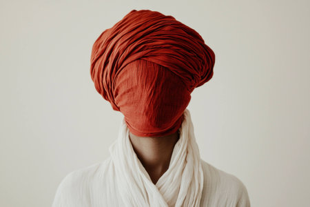 Mysterious figure with a head wrapped in red fabric, showcasing elements of cultural identity and artistic expression against a neutral background.