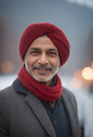 An Indian man wearing a red turban and a red scarf standing outdoors in winter, AI-generated.