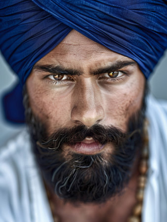 Man wearing a traditional blue turban and full beard looking directly at camera