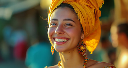 Smiling woman with a yellow turban on her head, Muslim, Female portrait