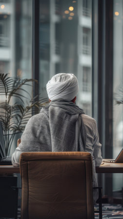back view of man in turban and scarf sitting at table in cafe