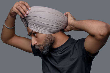 Calm concentrated male straightening the turban on his head