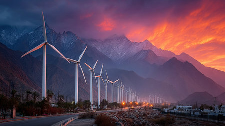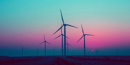 An artistic portrayal of wind turbines standing tall on rolling hills, bathed in vibrant sunset hues, representing clean energy and sustainable technology in nature.