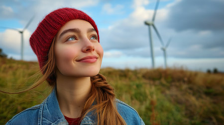 A young woman wearing a red beanie stands in a grassy field, smiling and looking up at the sky. Winds turbine tower behind her, highlighting a serene moment in nature.