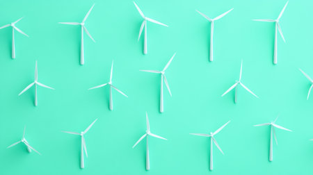 A visually striking arrangement of white wind turbines on a vibrant green background, symbolizing the importance of renewable energy and sustainability.