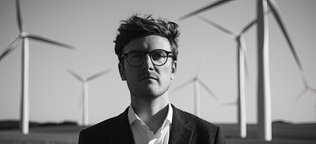 Guy standing in a field near wind turbines monochrome photo. Generated AI