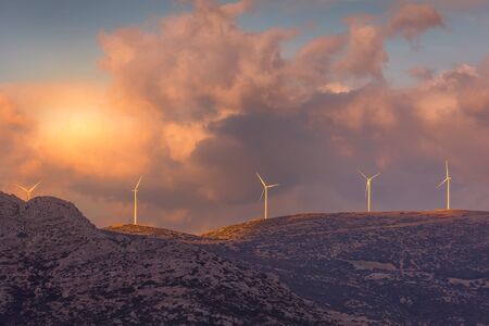 Industrial concept, wind farm turbines windmills generating power or energy, Greece