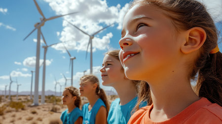 A group of children learning about renewable energy while visiting a wind farm, their expressions filled with wonder as they explore the turbines up close.