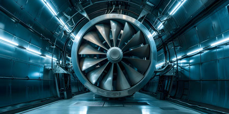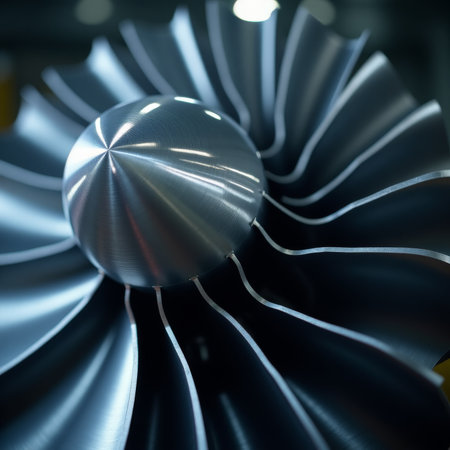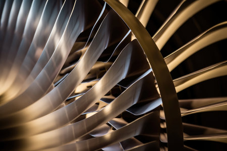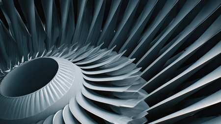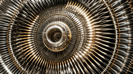 Explore the intricate design of an aircraft engine with a close-up view of stainless steel fan blades showcasing innovative technology and precision engineering.