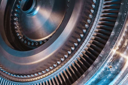 Turbine generator rotor with blades and discs, interior view. Elements, details and mechanisms of turbines. Energy and mechanical engineering